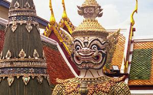 | 白亜の城壁に囲まれた1800平方kmの敷地に、エメラルド寺院と王宮が隣接して在る。ここには1784年ラマ1世によってラタナコーシン王朝が築かれた際、王宮と共に建設された最も格式の高い王立寺院で、ヒスイで作られた高さ66pの座仏像(元々ラオスのお寺に奉られていたのだが、戦利品として自国の本尊としてしまったもの)が安置されている事で有名である。 |