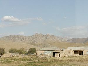 | 少し走ると切り立った山脈が近くに見えてきた。地平線の続く風景ばかりを見てきて、突然この様な山が見えると不思議な気がする。この山の向こう側が目的のサマルカンドなのだが、この山を迂回しながら進んでいるので余計に時間が掛かる。とは言っても、車の走れる道はこの一本しかないのだから仕方がない。 |